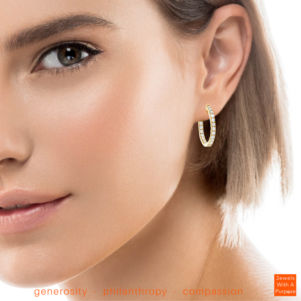 Make a statement wearing these exquisite hoop earrings, crafted in 925 sterling silver with gold overlay and Europe’s world-renowned zirconia crystals – the best simulated diamonds ever created! Micro-pavé stones adorn inside and out. Signature press and release safety clasp, hypoallergenic, lightweight, exceptional craftsmanship – overall stunners! Outstanding packaging for gifting, storing or for travel. Created exclusively for the nonprofit community! Market Value: $300
