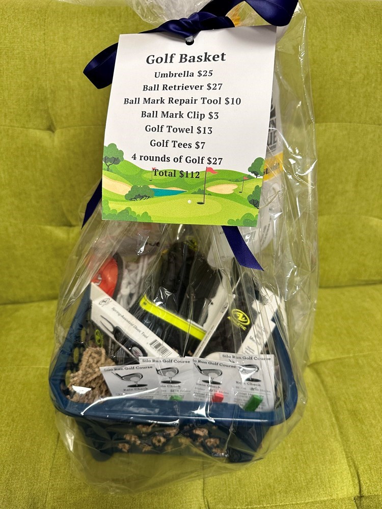 Golf Basket includes: 4 Rounds of 18 Holes of Golf at Silo Run Golf Course Umbrella Ball Retriever Ball Mark Repair Tool Ball Mark Clip Golf Towel Golf Tees
