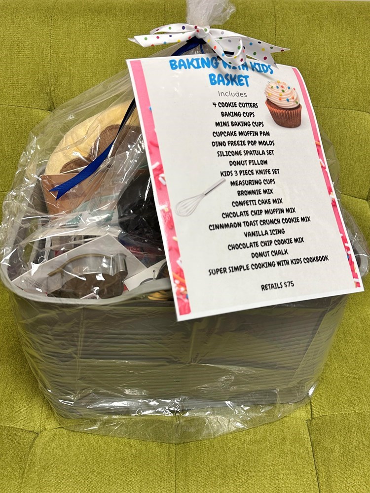 Baking With Kids Basket includes: 4 Cookie Cutters Baking cups Mini Baking cups Cupcake Muffin Pan Dino Freeze Pop Molds Silicone Spatula set Donut Pillow Measuring cups Kids 3-piece Knife set Brownie Mix Confetti Cake mix Chocolate Chip Muffin mix Cinnamon Toast Crunch Cookie mix Vanilla Icing Chocolate Chip Cookie mix Donut Chalk Super Simple Cooking with Kids cookbook Large gray tote