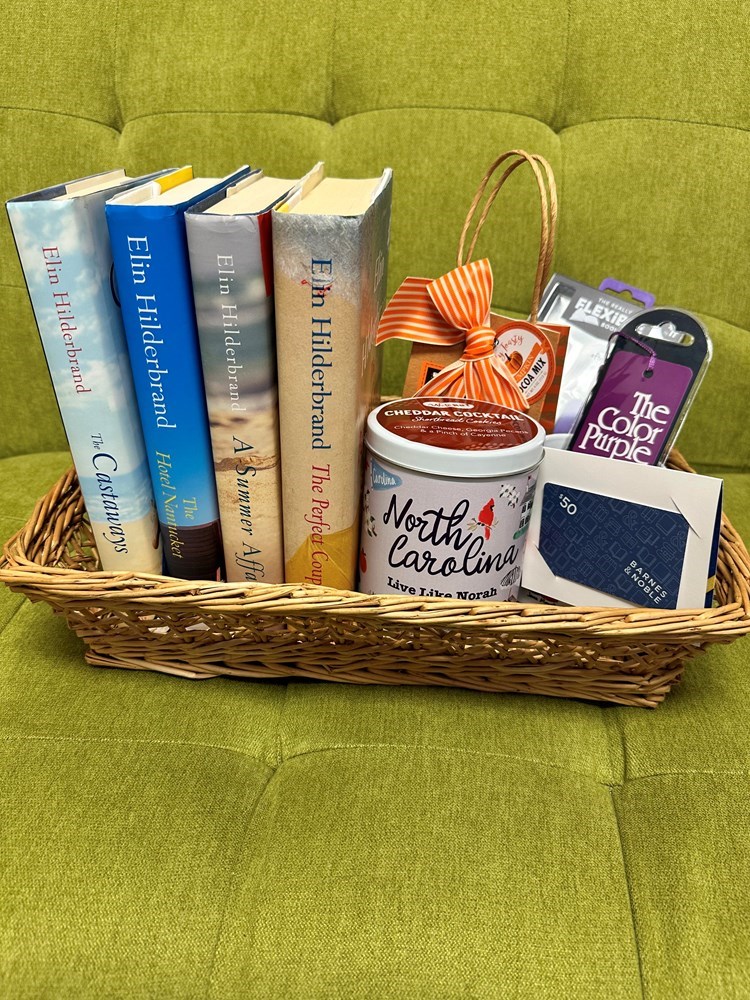 Elin Hilderbrand Book Basket includes: Books: A Summer Affair The Castaways The Hotel Nantucket The Perfect Couple Flexible Book Light The Color Purple Bookmark Barnes and Noble Coffee Cup Cheddar Cocktail Pumpkin Cocoa Mix $50 Barnes and Noble Gift Card