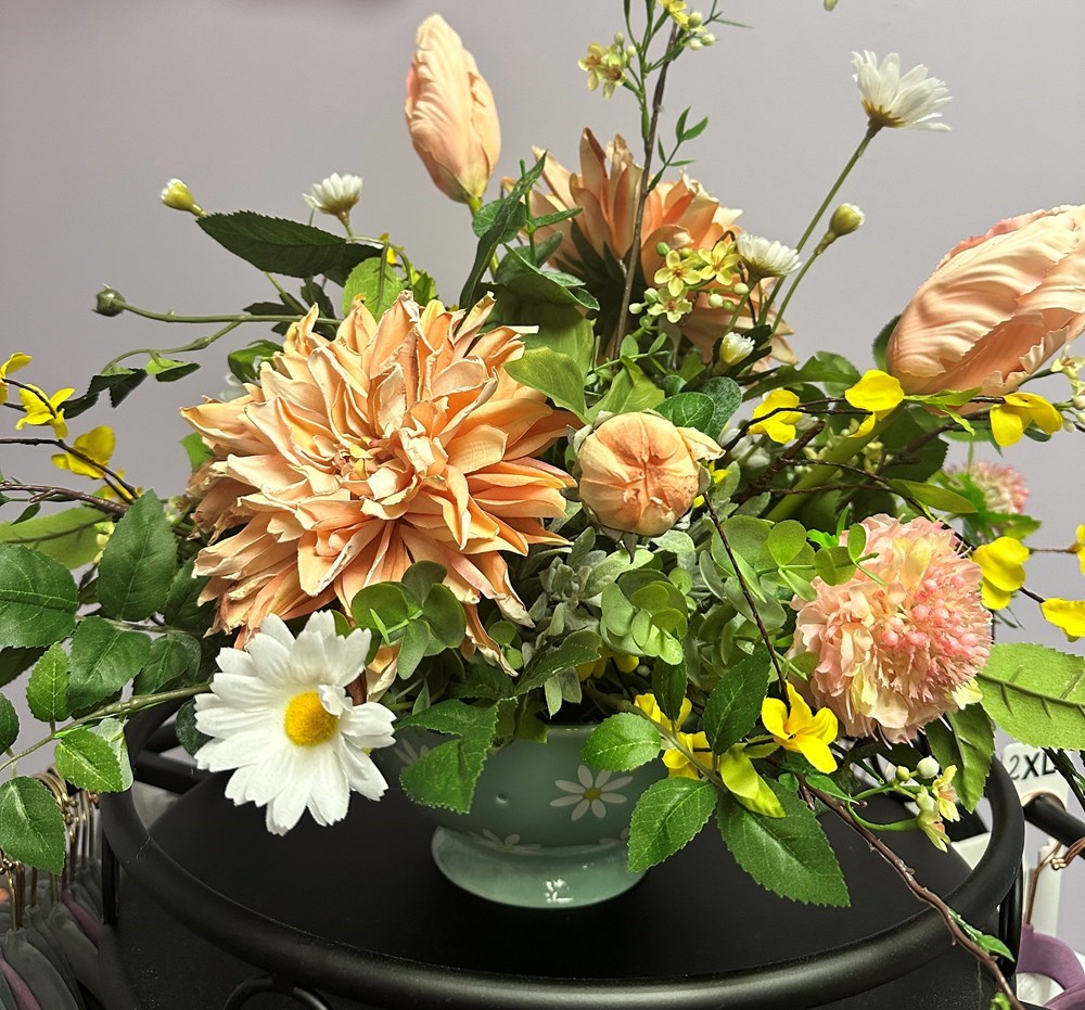 Blush and Peach Silk Floral arrangement in a daisy vase.