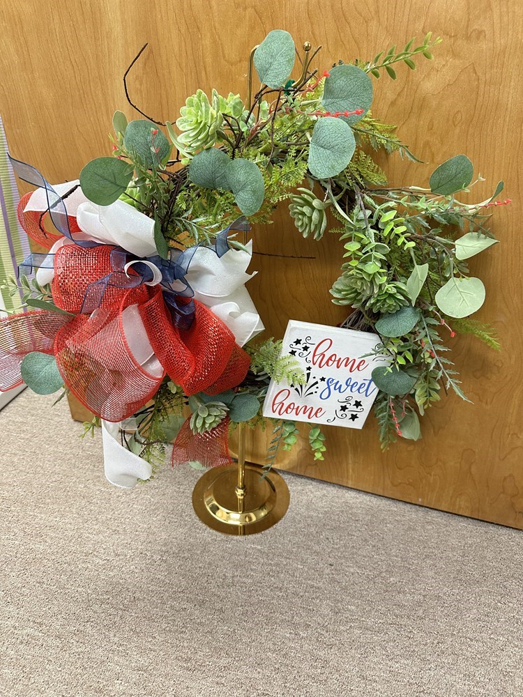 Grapevine wreath with "Home Sweet Home" plaque and Red, White and Blue bow
