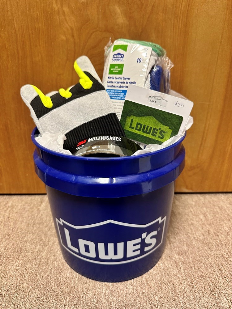 Lowes Tool Bucket includes: $50 Lowes gift card 2 rolls of 3M Duct Tape 1 pair leather workgloves 1 pack of 10 pair Nitrile Coated Grip Gloves 2 gallon Lowes bucket