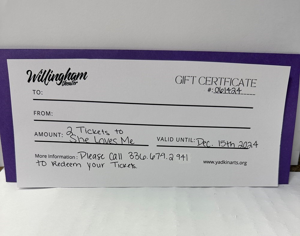 Two tickets to "She Loves Me" presented by Willingham Theater at Yadkin Cultural Arts Center. Valid Until Dec. 15, 2024.