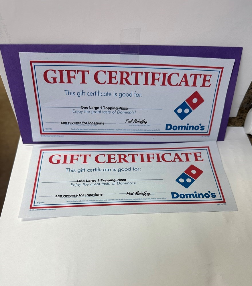 2 One Large One Topping Pizza gift certificates from Domino's in Yadkinville