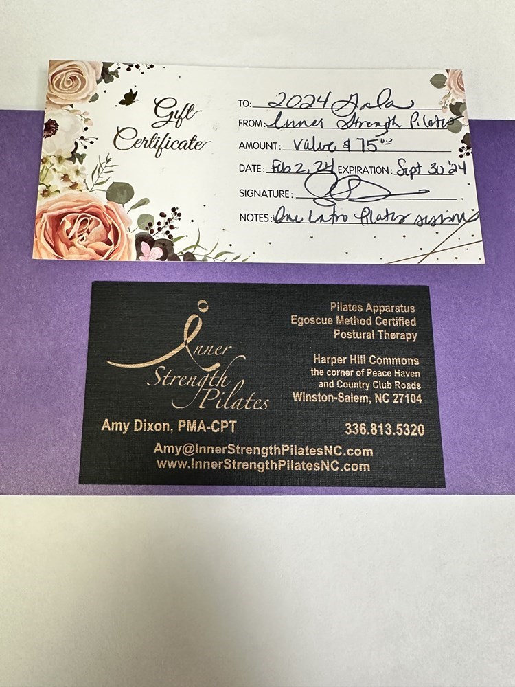 Inner Strength Pilates gift certificate for One Intro Pilates Session. VALID THRU DECEMBER 31, 2024.