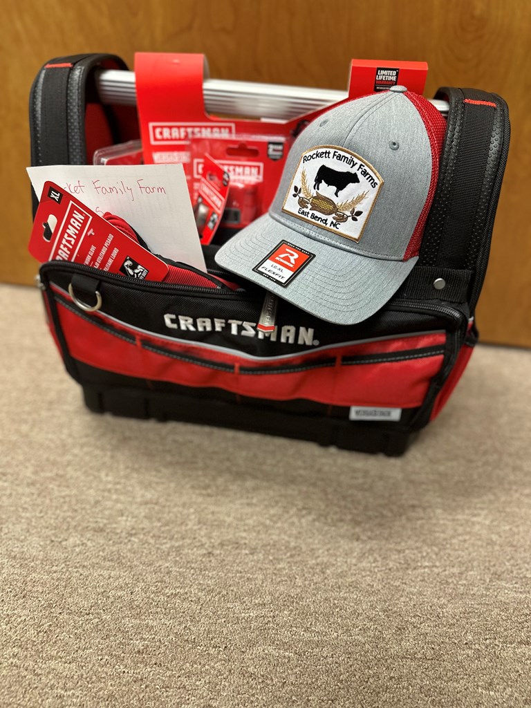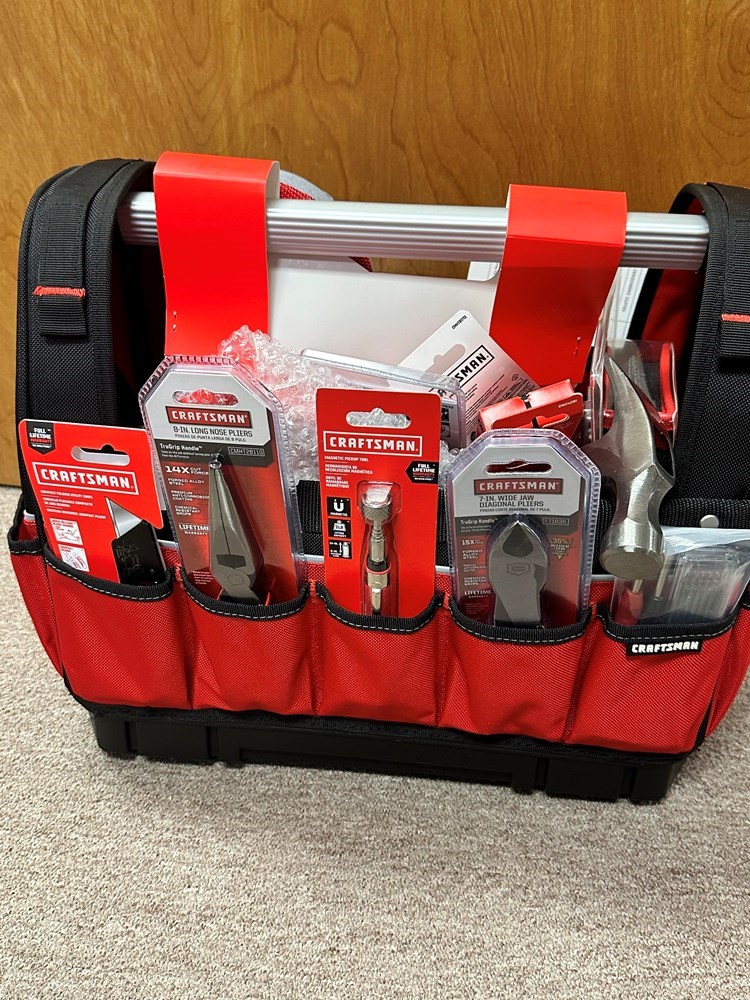 Craftsman Tool Bag includes: Craftsman Tool bag Rockett Family Farms ballcap Hacksaw Magnetic Pick Up tool Square Rafter Stud Finder 20 oz. Fiberglass Hammer 6" Joint Slip Pliers 8" Joint Slip Pliers Heavy Duty Stapler Folding Utility Knife 9" Torpedo Level 26 piece Ratcheting Screwdriver set 25 ft Tape Measure Work Light 8" Long Nose Pliers 7" Wide Jaw Diagonal Pliers Heavy Duty Work Gloves Magnetic Bowl Carpenter Pencils Multipurpose Tarp Shop Towels