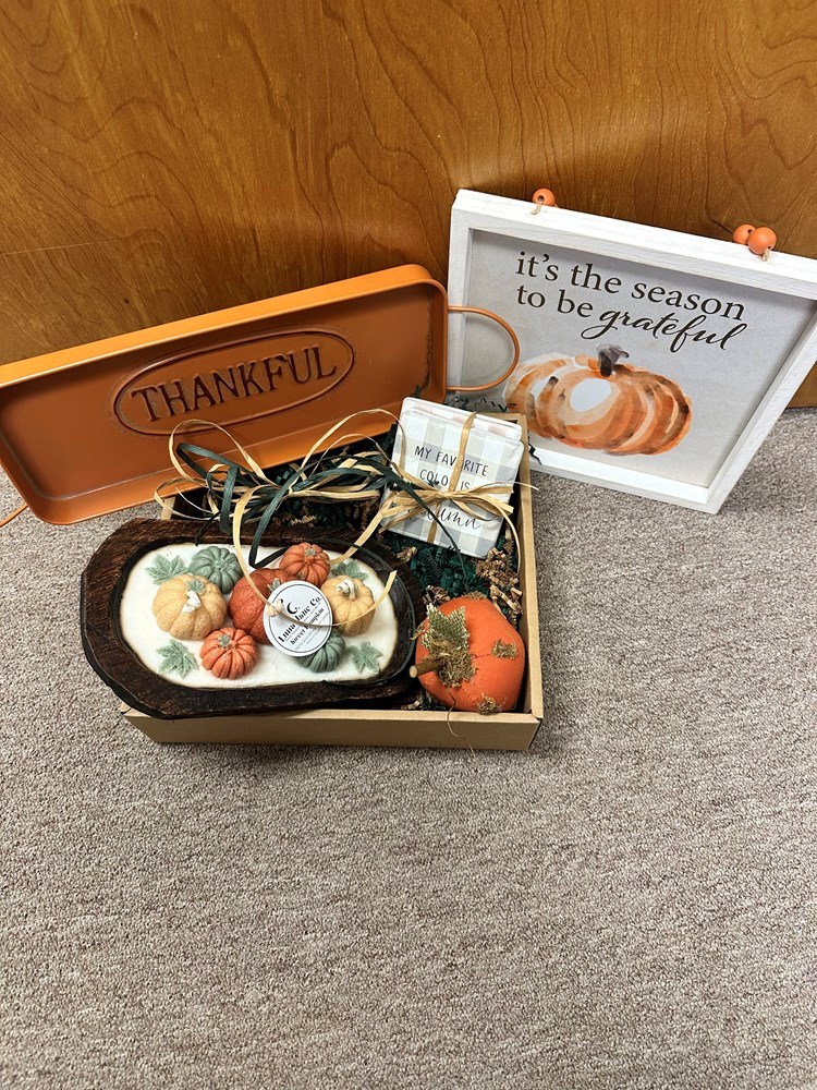Fall Basket includes: Stuffed Pumpkin "Thankful" Platter Set of 4 Fall Coasters "It's the Season to be Grateful" Pumpkin sign Pumpkin Blessing Bowl Candle