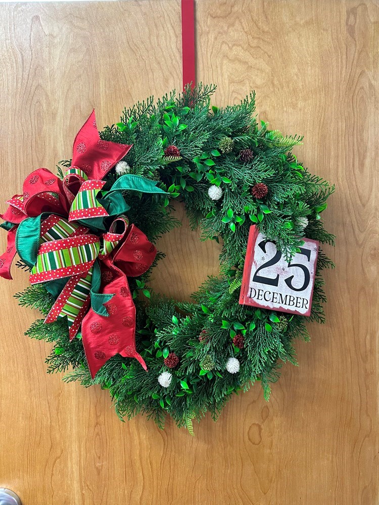 Beautiful evergreen Christmas wreath with ribbon and wooden December 25 plaque.