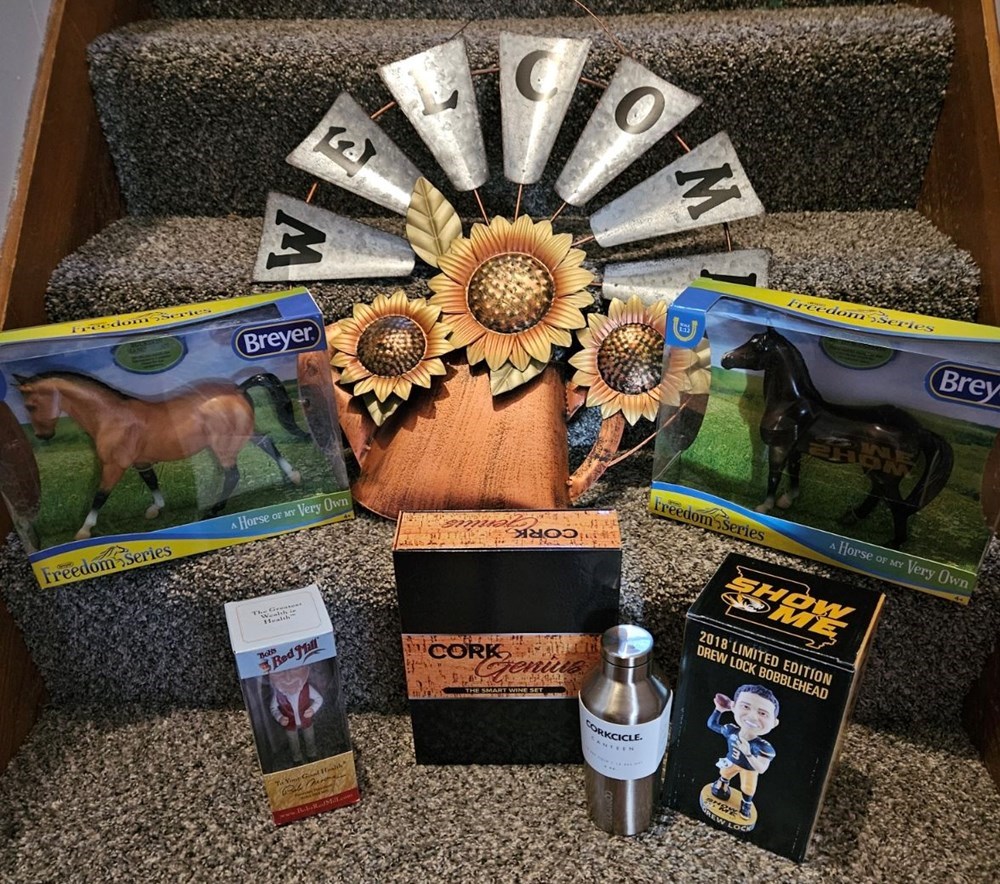 Items included are:Two Brayer collectible horses, two limited edition bobbleheads, a corsicle bottle, a welcome sign, and a Cork Genius. Shipping charges may apply for online bidders.
