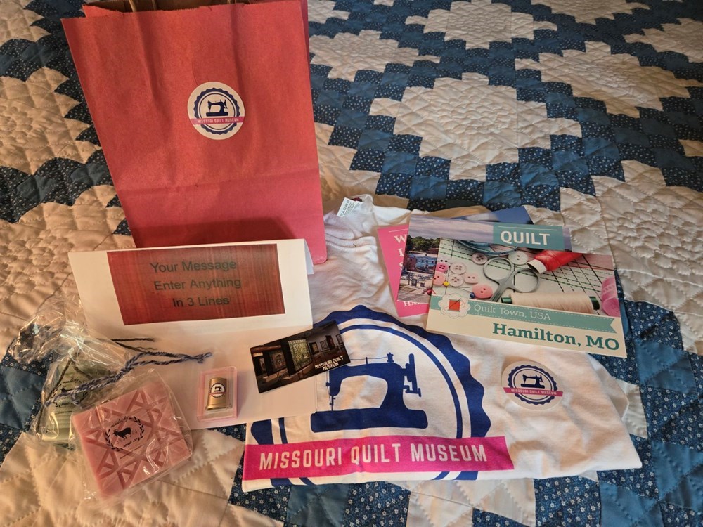 This includes a t-shirt, thimble, 2 got milk soaps and a free brick engraving at the Missouri Quilt Museum. Shipping fees may apply for online bidders.