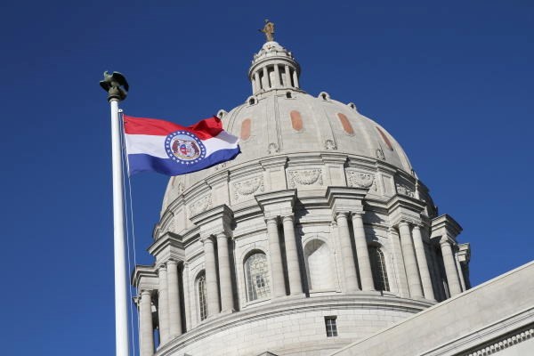 Missouri Flag and US Flag Flown Over the Capitol with a God Bless America Sign