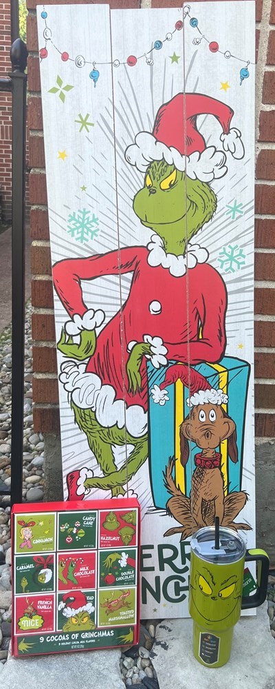 Grinchmas decor, tumblers and hot chocolate assortment will add a smile to your holiday season. Shipping fees may apply for online bidders.