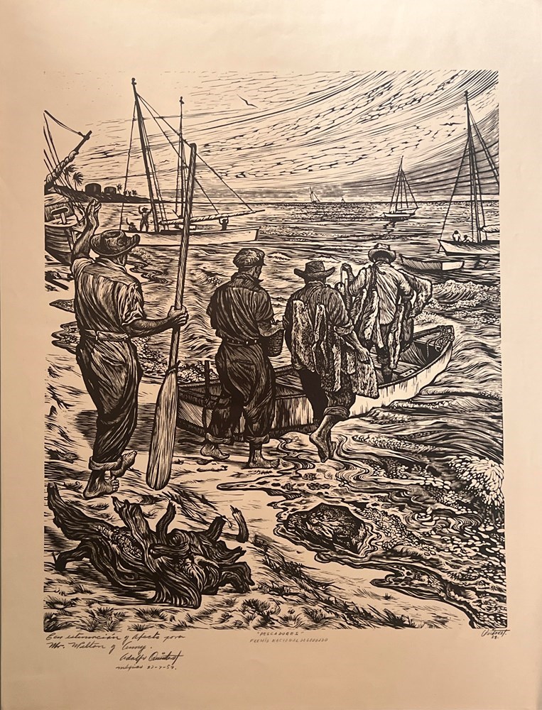 Artist - Adolfo Quinteros Gomez Title - Unknown A postwar and contemporary artist, Adolfo Quinteros Gomes (1927 - 1994) was born on June 1st in the city of Chihuahua and moved to Mexico City in 1951 thanks to a scholarship from the government. He studied art at the Academia de San Carlos until 1955. He joined the Taller de Grafica Popular in 1956 and became general secretary of the organization in 1960 and again in 1963. Since 1957 he was a member of the Salon de la Plastica Mexicana. In 1959 he traveled to Czechoslovakia, the Soviet Union, Germany and Holland. He became a co-founder of the Jardin del Arte and in 1966 and 1967 it's president. That same year he left the TGP. His work has become an important piece of Mexican art history and can be seen in private collections and museums such as the Spencer Museum of Art at the University of Kansas. His work, over time has become more and more valuable.