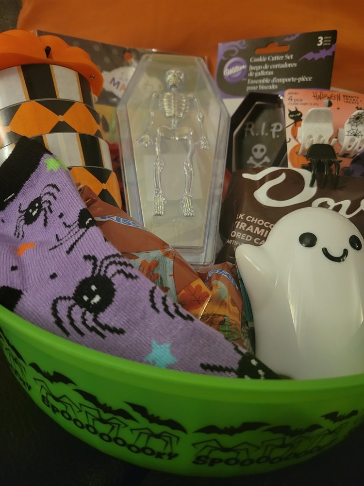 Ready for Halloween, this basket has it all plus more!! Be ready for the ghouls and goblins with the candy and treats included in this basket. Four Halloween themed glasses Halloween cookie cutters Frankenstein craft project Light up pumpkin and ghost Candy and much more!!!! After the Trick & Treating, enjoy the $15 gift card from Wendy's or Jimmy John's Donated by John & Kristen Lyons
