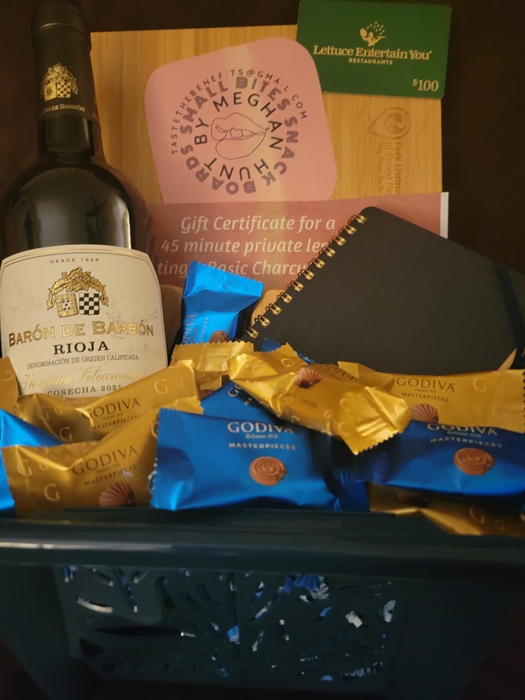 Feed Your Entertainment Small Bites by Meghan Hunt will give you a hands on 45 minute lesson on how to construct a charcuterie board (Donated by Meghan Hunt) You can do your charcuterie board on this all in one board (Donated by the Park District of Forest Park) accompany by Baron DeBaron Rioja wine (Donated by Brittany Tamol) Entertainment is not complete with out writing down you great ideas in these two stationary books (Donated by Michelle Melin-Rogovin) Or maybe at the end of the day, you want to just go out for dinner, it will be easy with a $100 gift certificate (Donated by 209 Board Member Colleen Rosa)