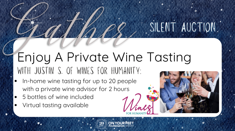Enjoy a 2 hour private in-home wine tasting for up to 20 people with a wine advisor from Wines from Humanity. 5 bottles of wine are included. For those located outside of the greater Chicago area, a virtual tasting is also available. **If you win this item and did not attend Gather, you will be emailed information on how to redeem the week of August 11. There is a nominal $22 shipping and handling fee that must be paid directly to Wines For Humanity, by the winner, for the wine samples. This fee is not included and will be arranged directly with the wine advisor once your tasting is scheduled.**