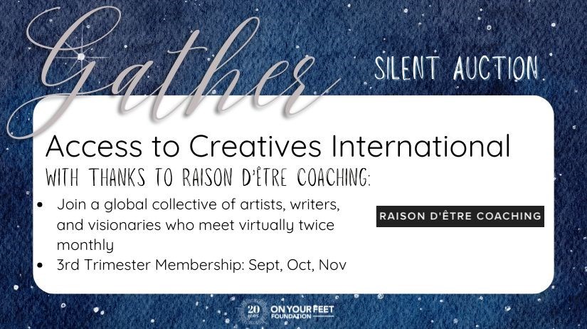 If you win this item, you'll get one (1) Creatives International 3rd Trimester Membership (valid for September, October & November 2025). Creatives International is a global collective of artists, writers, and creative visionaries of every kind who meet virtually twice monthly. The session formats include both 90 min Masterminds and 60 min Expert Mentorship Talkbacks. In this cohort space, members address creative blocks, nurture creative process and foster new opportunities through sharing their work with other artists. Donated by Stephanie Casaubon and Raison d'être Coaching. **If you win this item, information on how to redeem will be emailed to you the week of August 11. **