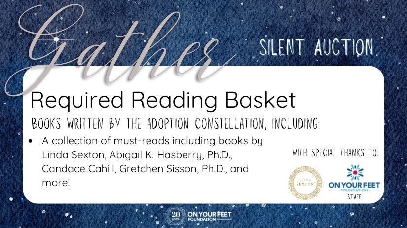 Win a "Required Reading" Book Basket! You'll get a collection of must-reads written by the adoption constellation, including: • The Branches We Cherish: An Open Adoption Memoir by Linda Sexton (autographed paperback) • Adopting Privilege: A Memoir if Reinventing My Adoptee Narrative by Abigail K. Hasberry, Ph.D. (hardcover) • Goodbye Again: A Memoir by Candace Cahill (paperback) • Finding Hope: A Birthmother's Journey into the Light by Hope O Baker (paperback) • Relinquished: The Politics of Adoption and the Privilege of American Motherhood by Gretchen Sisson, Ph.D. (hardcover) **If you win this item, pickup is available at the auction table at Gather. Otherwise, local pickup can be arranged in Evanston, Illinois. Shipping for this item is also available. Shipping fees are not included in the winning bid and must be paid separately when shipping arrangements are made.**