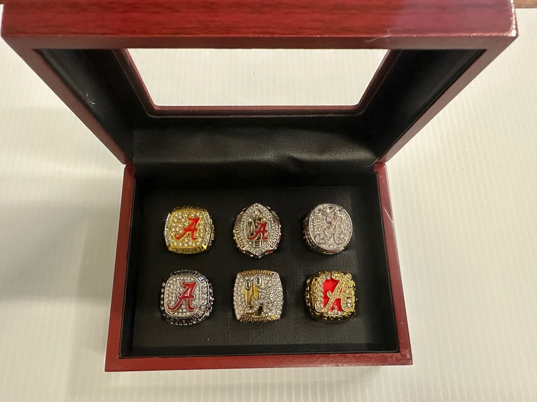 This exclusive set features high-quality replicas of all six of Alabama football's championship rings from the Nick Saban era. Each ring is crafted from durable alloy and comes housed in a premium wooden display box, making it a must-have for any dedicated Crimson Tide fan. INCLUDES: - 6 high-quality replica rings - Display case - Shipping within the continental United States. Location: Auburn, GA Details: Alabama Replica Championship Rings, Auburn, GA Restrictions: Valid for shipping within the continental United States. Book within 9 months of purchase. Valid: Valid for shipping within the continental United States.