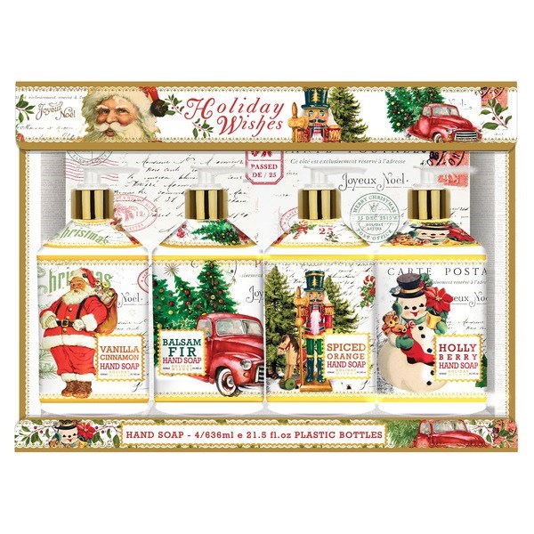 Holiday Hand Soap Gift Set – Vintage-Inspired Collection (Set of 4) Bring a touch of nostalgic charm to your holiday season with this beautifully packaged set of four vintage-inspired hand soaps. Each bar is crafted to capture the warmth and magic of the holidays, featuring luxurious scents that evoke cozy memories and festive cheer: ✨ Orange Spice – Bright citrus blended with warm clove and cinnamon 🍒 Winter Berry – A sweet, crisp fragrance reminiscent of frosted berries 🍦 Vanilla – Creamy and comforting, like a holiday treat by the fire 🌲 Balsam Fir – Fresh evergreen notes that transport you to a snowy forest Perfect for gifting or adding a touch of seasonal elegance to your own home, this set combines timeless style with indulgent fragrance. Treat yourself—or someone special—to a little holiday luxury!