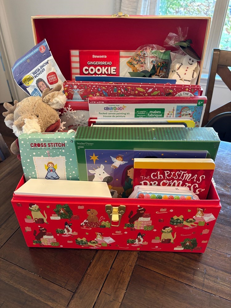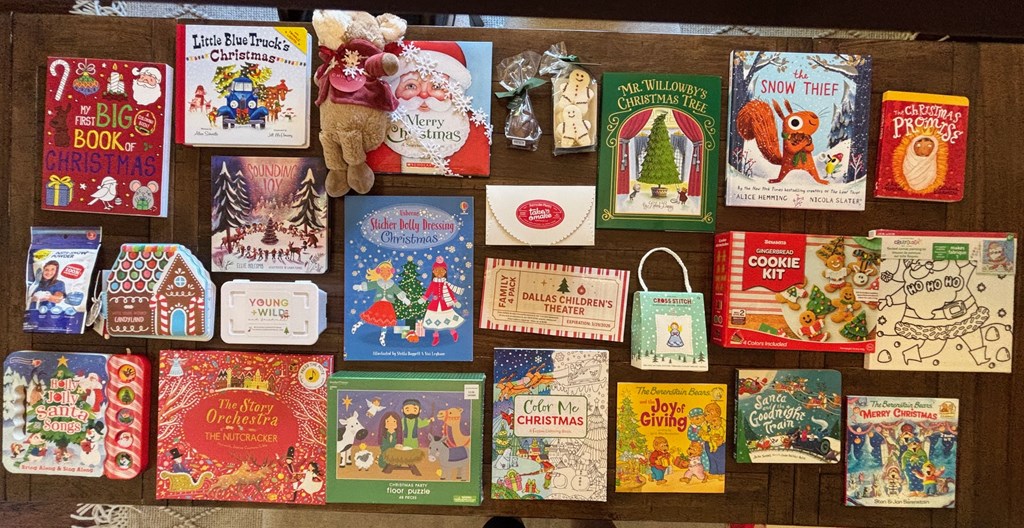 "$150 - Dallas Children's Theatre - Family 4 pack tickets $140 - Christmas Books $65 - Activities & Interactive Books $35 - Pint Sized Prints Take n Bake Ornament $30 - C+B Hot Chocolate Bomb & Gingerbread Marshmallows $25 - Gingerbread Cookie Decorating Kit $15 - Young, Wild & Friedman Holiday Playdoh Set $15 - Make your own Snow Kit $15 - Nativity Floor Puzzle $10 - CrossStitch Kit Retail Value: $500