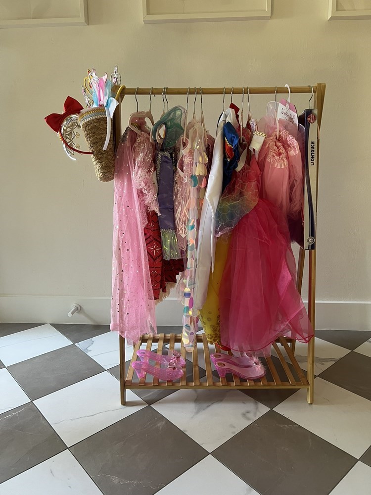 "Moana Dress - $22 Unicorn Mermaid Dress - $25 Pink Princess skirt and accessories - $15 Dr Outfit and Accessories - $20 Sword and Shield - $30 Purple Mermaid Outfit - $27 Purple Fairy Outfit - $30 Snow White - $20 Pink Cape - $28 Sleeping Beauty - $22 2 Pairs Dress Up shoes - $30 4 Skirts - $15 Clothing Wrack - $50 Accessories Basket - $25 TOTAL VALUE - $359"