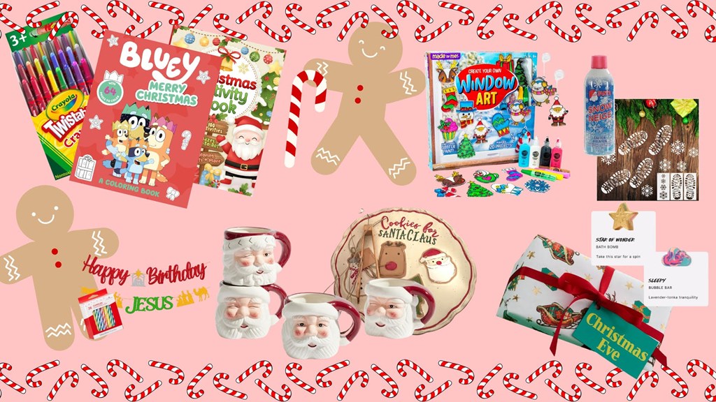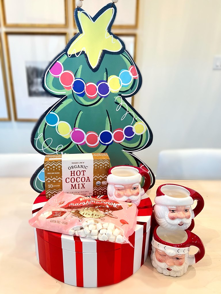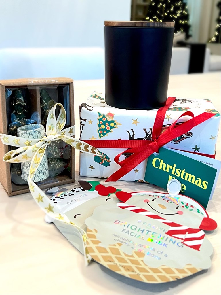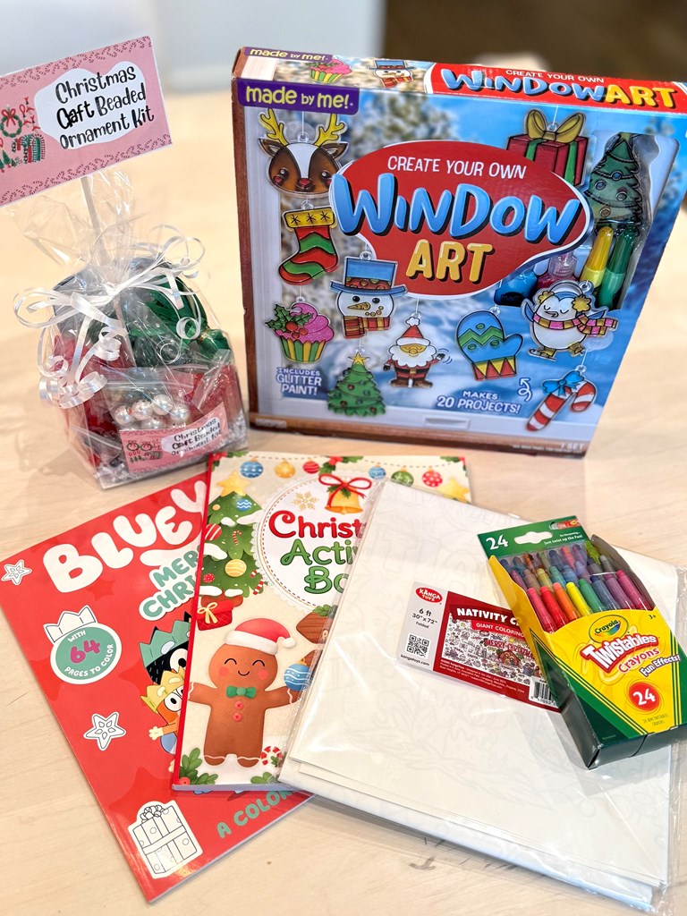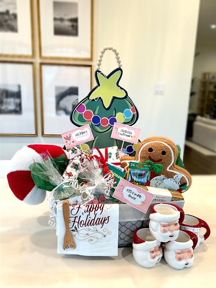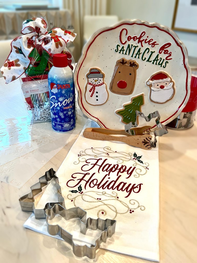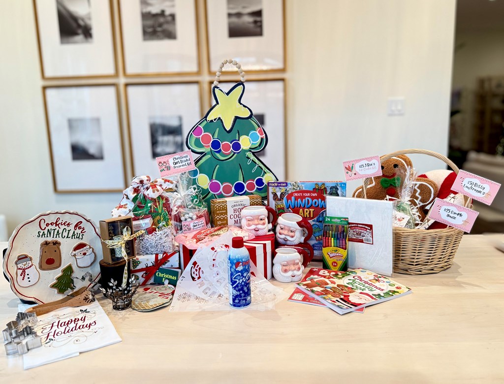 1. The store at Lake Highlands “the big tree decoration“- $53 2. Bromley Gardens goodies- $60.62 (Candle holder, candles, Holiday decorative towel) 3. Happy birthday Jesus goodie bag - $10 4. Window art craft kit- $15 5. Santa Feet kit (Stencils & spray snow)-$15 6. Lush Bath bombs- $20 7. Decorative Christmas pillows- $20 8. Christmas cookie plate -$40 9. Christmas Santa mugs (4) -$ 70 10. Christmas cookie cutters- $20 11. Crayons-$8 12. Coloring books- $12 13. Hot cocoa and marshmallows- $10 14. Christmas coloring banner- $10 15. Christmas bead kit- $15 16. Facial masks (2) - $5 17. Sample house gift card - $25 18. J. Rae’s gift card for holiday cookie kit -$25 19. Betty Lou/Froggies gift card - $50.00 20. Reindeer Food Kit (Oats & sprinkles) $5 Retail Value: $488