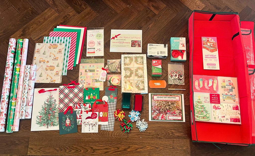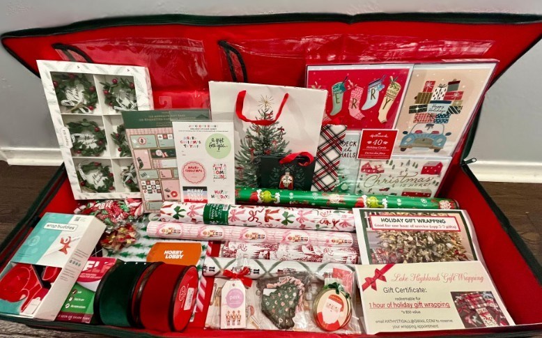 "Christmas Gift Wrapping Basket 1. 2 hours of Holiday Gift Wrapping Service (local in Lake Highlands) - $100 value 2. Hobby Lobby Gift Card - $50 3. Gift Wrap Organizer - $23 4. Six rolls/sheets of designer inspired wrapping paper - $75 - Colorful Bow print (Heavy Duty & Large Roll) - Grinch print (Heavy Duty & Large Roll) - Pink Bow Nutcracker print (Heavy Duty & Large Roll) - Red/Green Nutcracker Traditional Print - Red Christmas Toile Print - Christmas Construction Vehicle Print (Folded Sheets) 5. Assorted Classic Christmas Gift Bags (16 Bags: S, M, L, Bottle) - $20 6. Christmas Tissue Paper (120 sheets) - $10 7. Joy Creative Co. Sticker Labels and Gift Tags - $15 8. Fringe Sticker Labels & 2 sets of gift tags (Trees, Santas, Nutcrackers) - $25 9. Set of 6 Christmas Wreath Gift Toppers - $10 10. Two rolls (dark green/red) of Martha Stewart Velvet Ribbon - $10 11. Christmas Washi Tapes (set of 12) - $10 12.Wrap Buddies Tabletop Gift Wrapping Tool with Tape Dispenser (set of 2) - $25 13. Little ELF Wrapping Paper Cutter (2-pack) - $15 14. Scotch Gift Wrap Tape (6 rolls) - $10 15. Metallic Calligraphy Pens- $10 16. Hallmark Holiday Cards (set of 40) - $20" Retail Value: $428